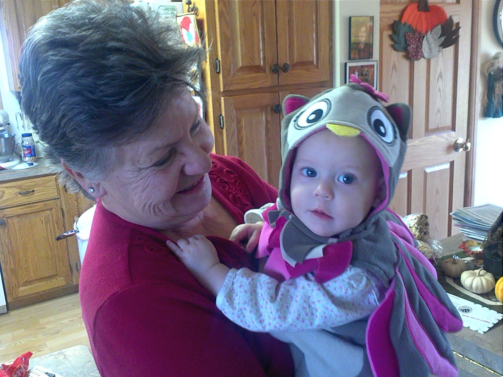 Marley's first Halloween was a success. We only went to the grandmas houses but it was still fun to see her all dressed up in her little owl outfit. She looked super cute but didn't know she was dressed up at all. Her little owl top was stuffed and it didn't seem to bother her one bit. haha.